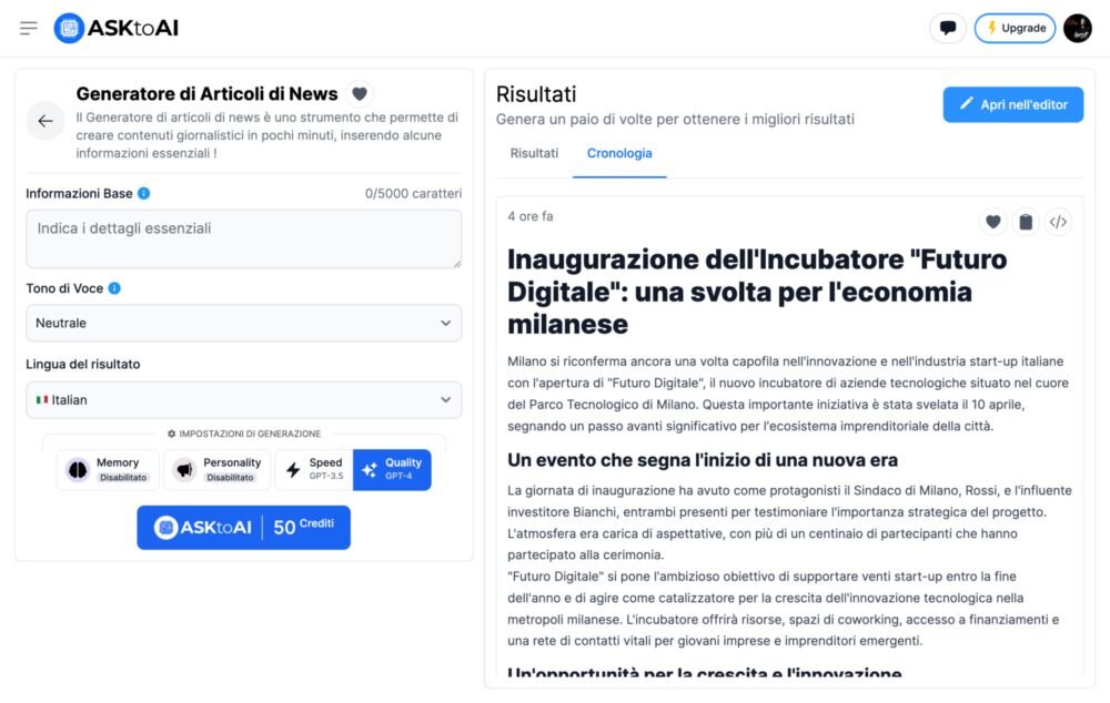 La scrittura di notizie non è mai stata così semplice e veloce. Affidati al Generatore di Articoli di News di ASKtoAI per comunicare con autorevolezza e mantenere la tua presenza digitale sempre attuale e professionale.