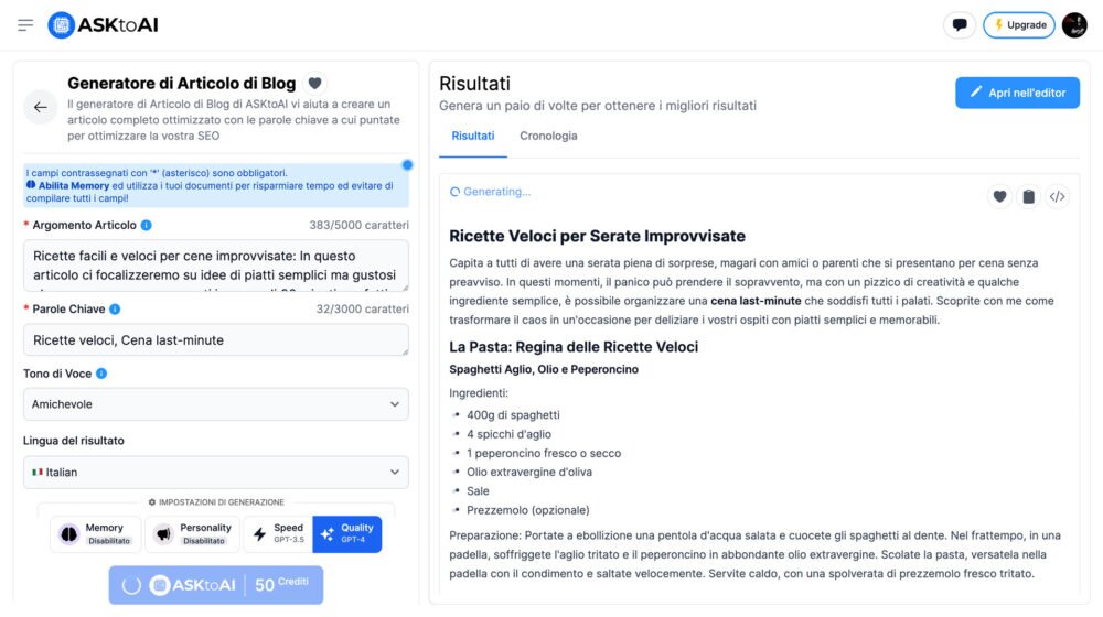 Per capire nel dettaglio come poter abilitare e impiegare ASKtoAI Memory con il Generatore di articolo di Blog, ti invitiamo a visitare la pagina Come Utilizzare Memory, e a trasformare la tua strategia di contenuti.
