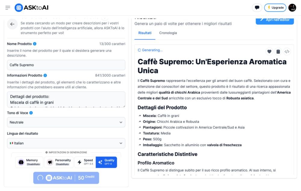 Il Generatore di Descrizione Prodotto di ASKtoAI costituisce una soluzione rivoluzionaria ed essenziale per trasformare completamente il modo in cui presenti i tuoi prodotti al pubblico.