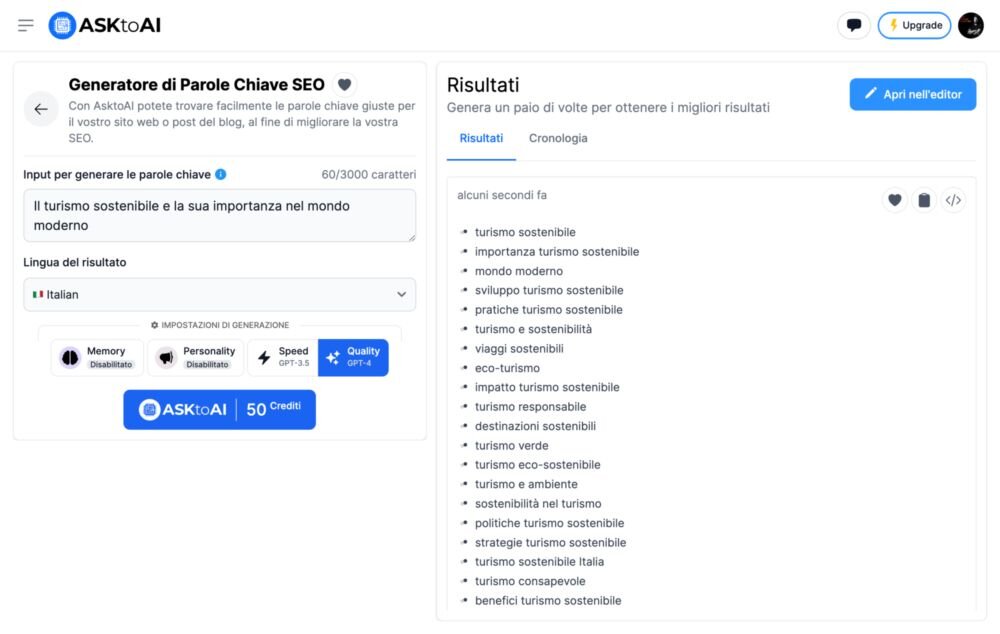 Inizia ora a migliorare la tua presenza online con il Generatore di Parole Chiave SEO di ASKtoAI: qualità, innovazione e avanzate soluzioni AI al servizio della tua creatività e del tuo successo online.