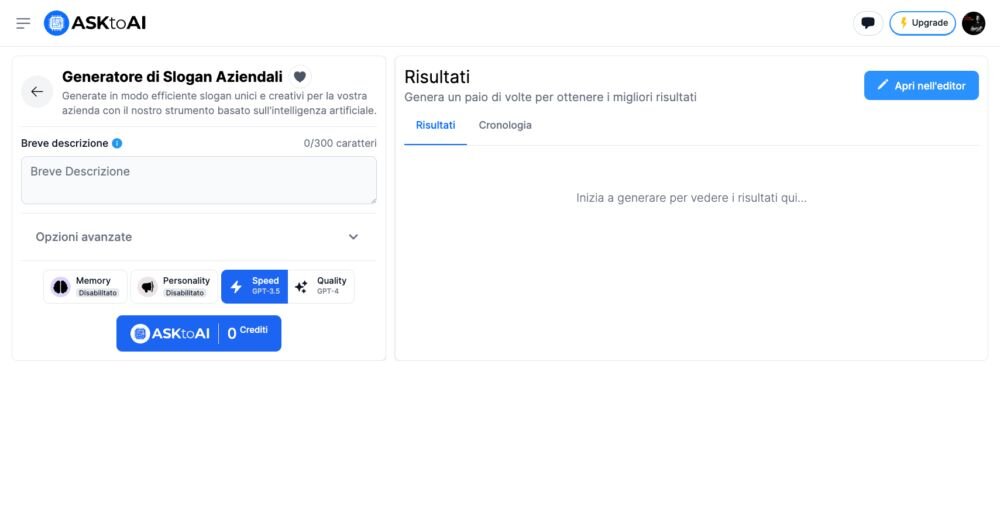 Il Generatore di Slogan Aziendali di ASKtoAI è lo strumento che trasforma la creatività in efficienza: ecco la soluzione per come creare uno slogan aziendale a effetto, che lasci un'impronta distintiva nell'ecosistema del branding.