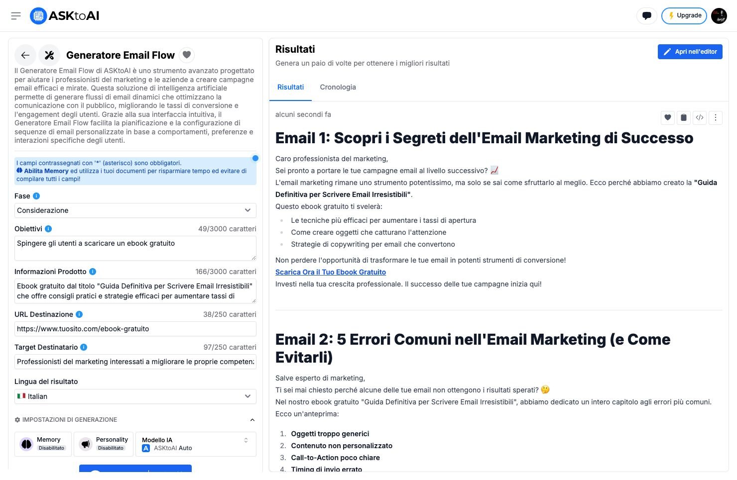 ora o mai piùIl Generatore Email Flow di ASKtoAI è la soluzione ideale per elevare le tue strategie di email marketing. Immagina di poter inviare il messaggio giusto, al momento giusto, a ogni singolo utente.