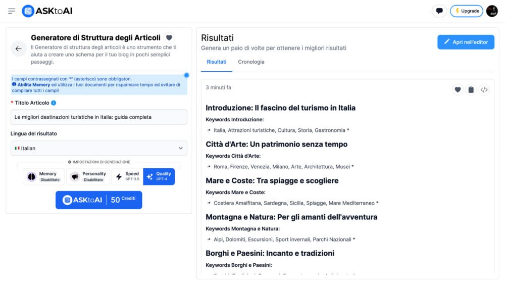Scopri il Generatore Struttura Articolo, lo strumento indispensabile per creare contenuti di alta qualità. Questo software automatizzato è progettato per generare schemi di articoli basati sui tuoi input. Non solo trova i titoli appropriati e i sottotitoli, ma ti offre anche una serie di parole chiave per ogni paragrafo utili a organizzare il tuo articolo in modo coerente ed efficace.