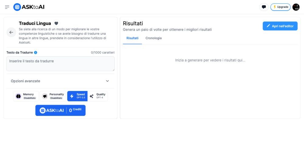Utilizzando il Traduci Lingua si accede a un mondo senza confini linguistici, dove è possibile migliorare l'engagement con un pubblico globale e ottimizzare la comunicazione nelle diverse lingue. Con ASKtoAI, raggiungere nuovi mercati e interagire con clienti e partner internazionali non è mai stato così semplice.